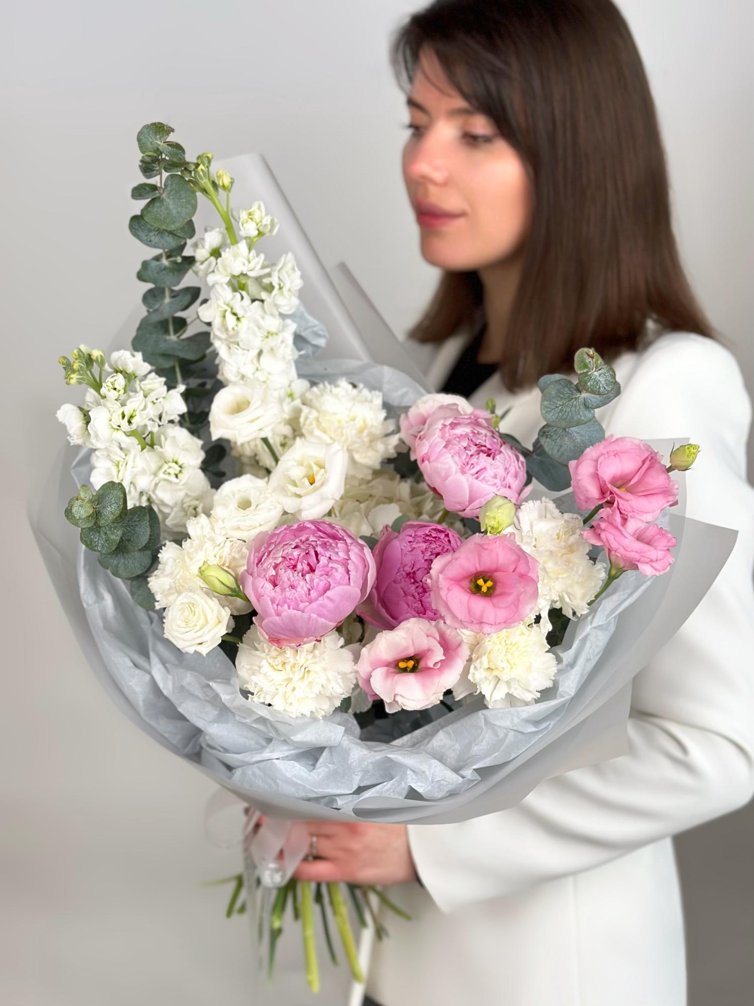 АРОМАТНЫЙ БУКЕТ С ПИОНАМИ, МАТТИОЛОЙ И ЭУСТОМОЙ