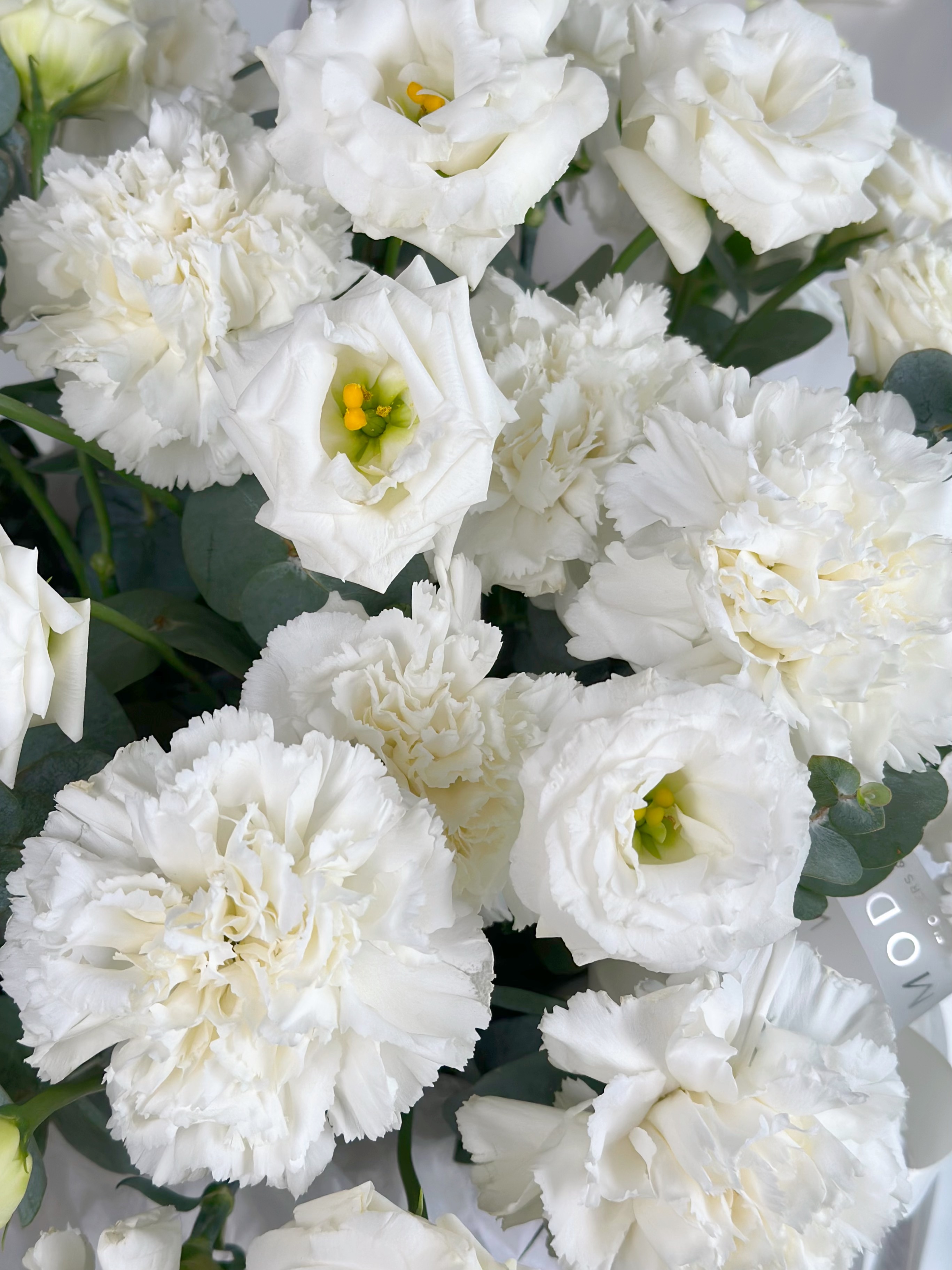 БЕЛОСНЕЖНАЯ КОРЗИНА С ЭУСТОМОЙ И ГВОЗДИКОЙ