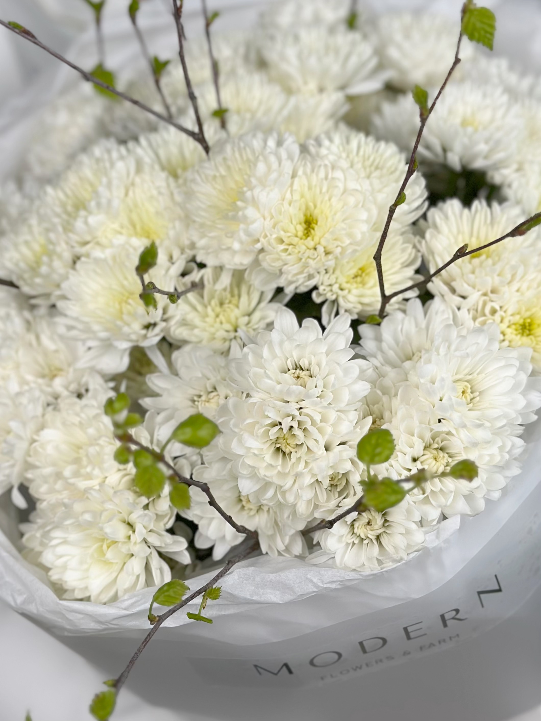 —БЕЛОСНЕЖНЫЙ БУКЕТ ИЗ ХРИЗАНТЕМЫ И ВЕСЕННИХ ВЕТОЧЕК