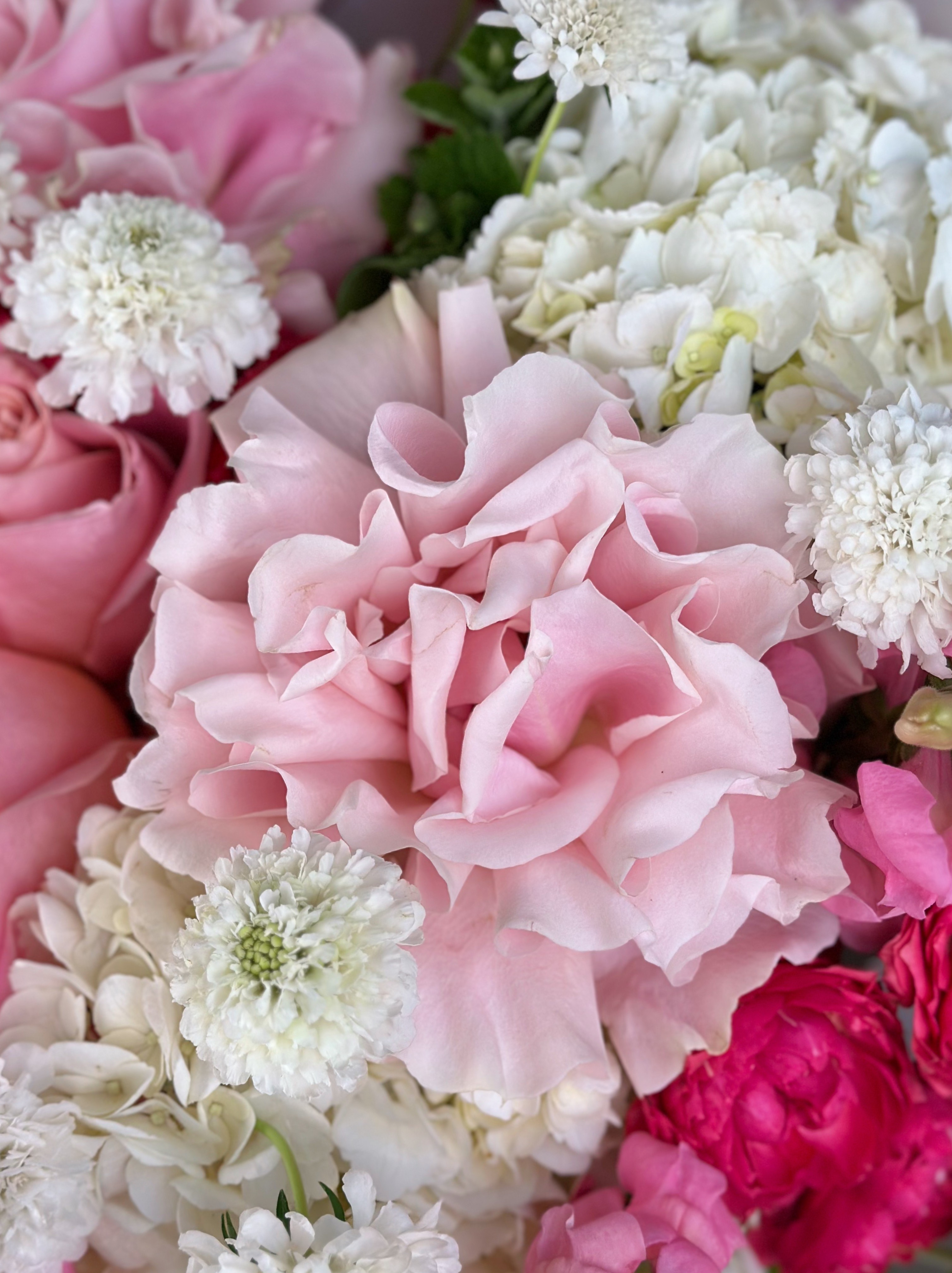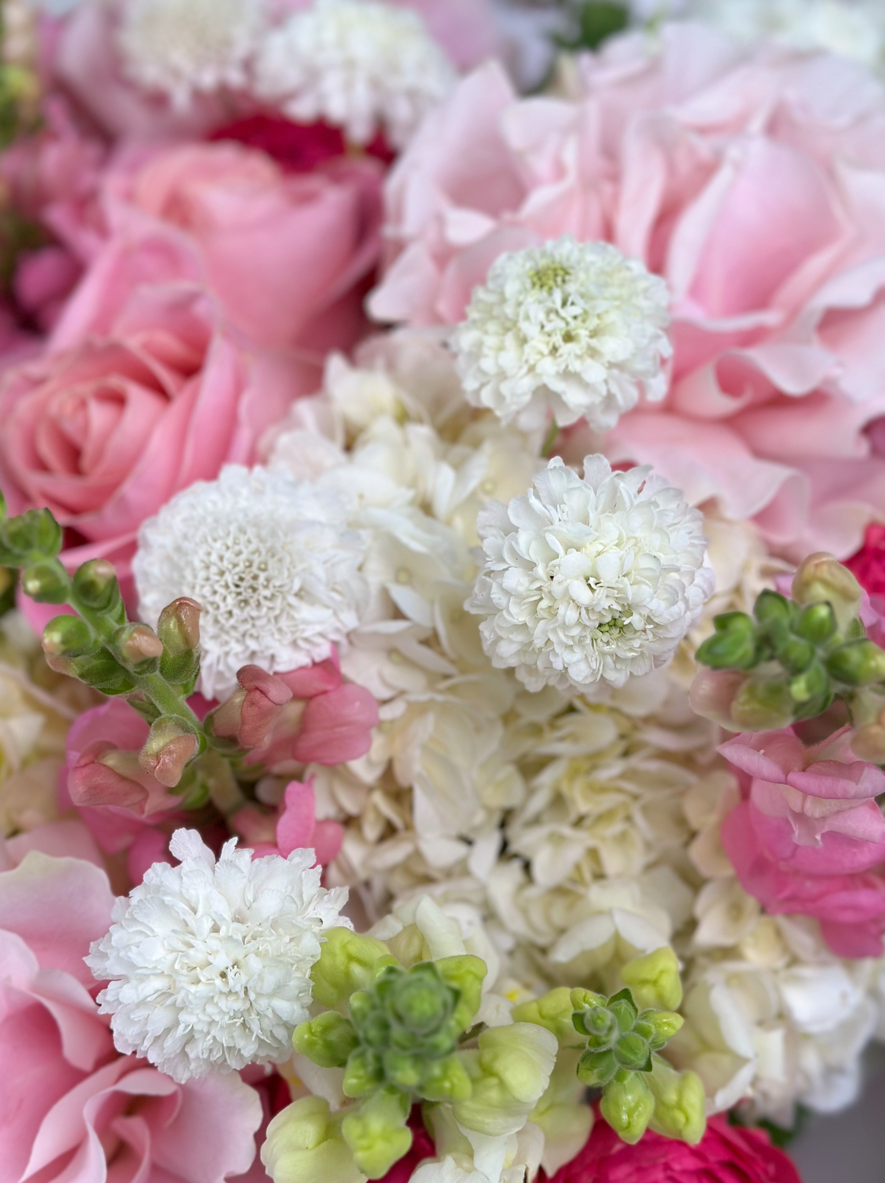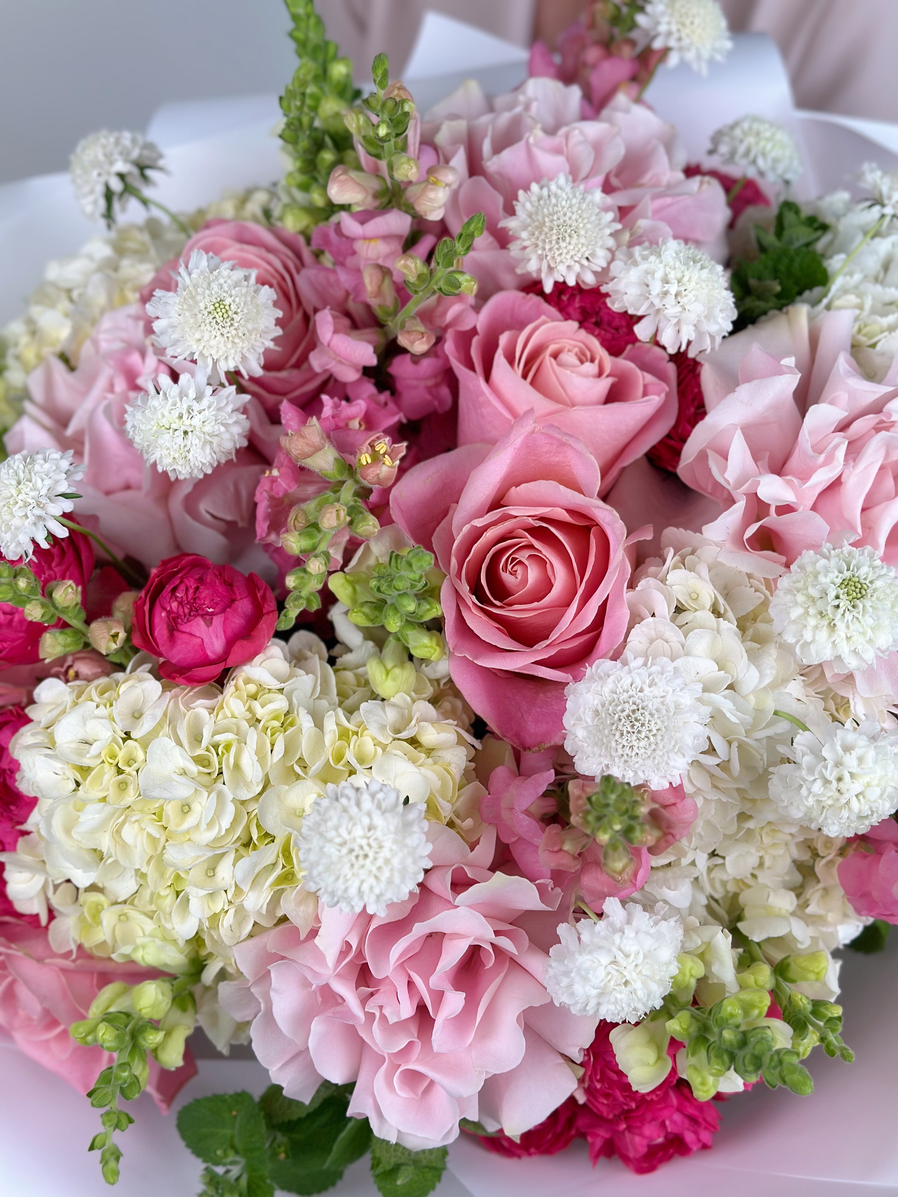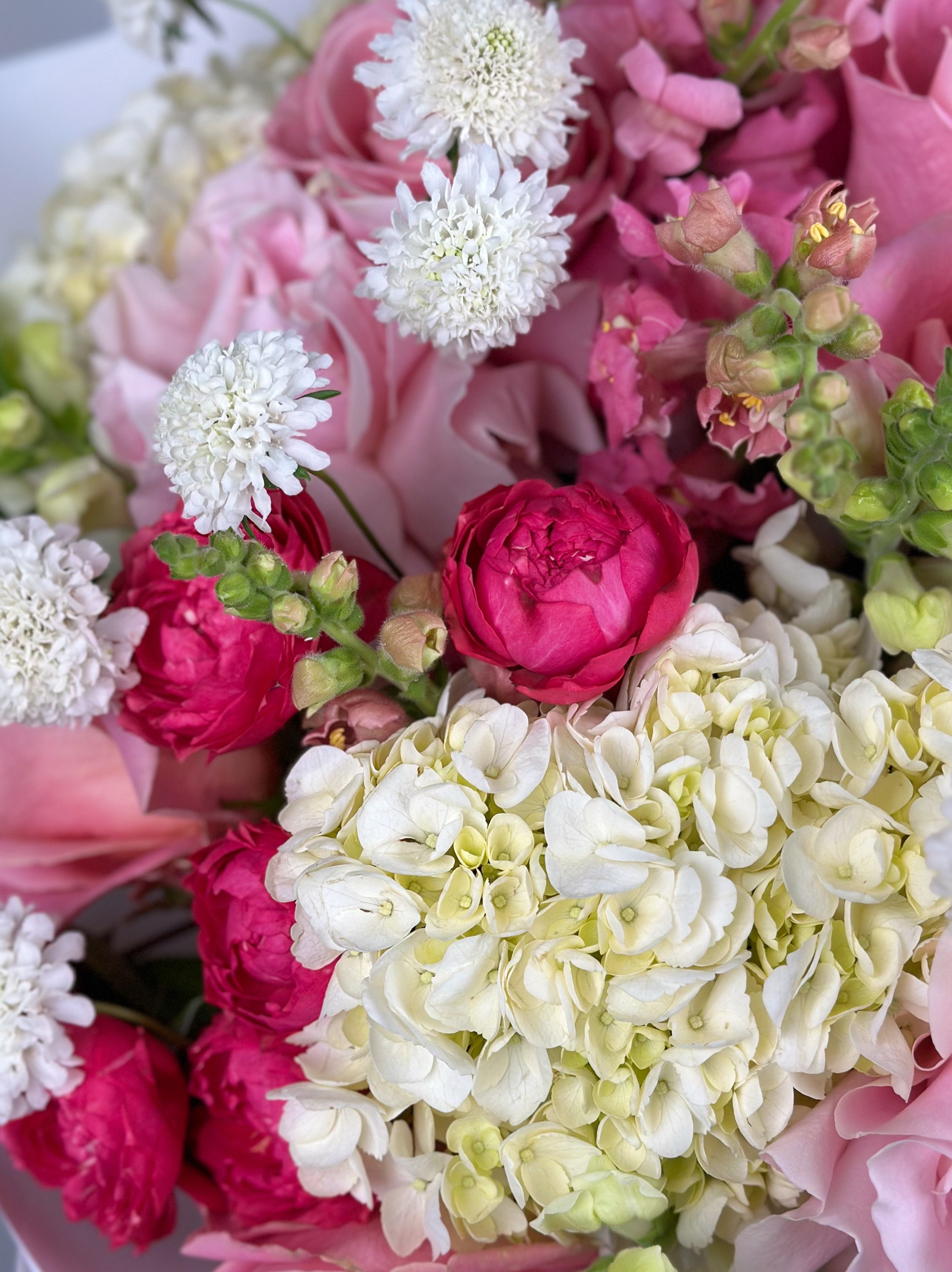 Представляем вашему вниманию торжественную цветочную композицию, где благородство пионовидных роз переплетается с изяществом гортензий и утонченностью львиного зева.