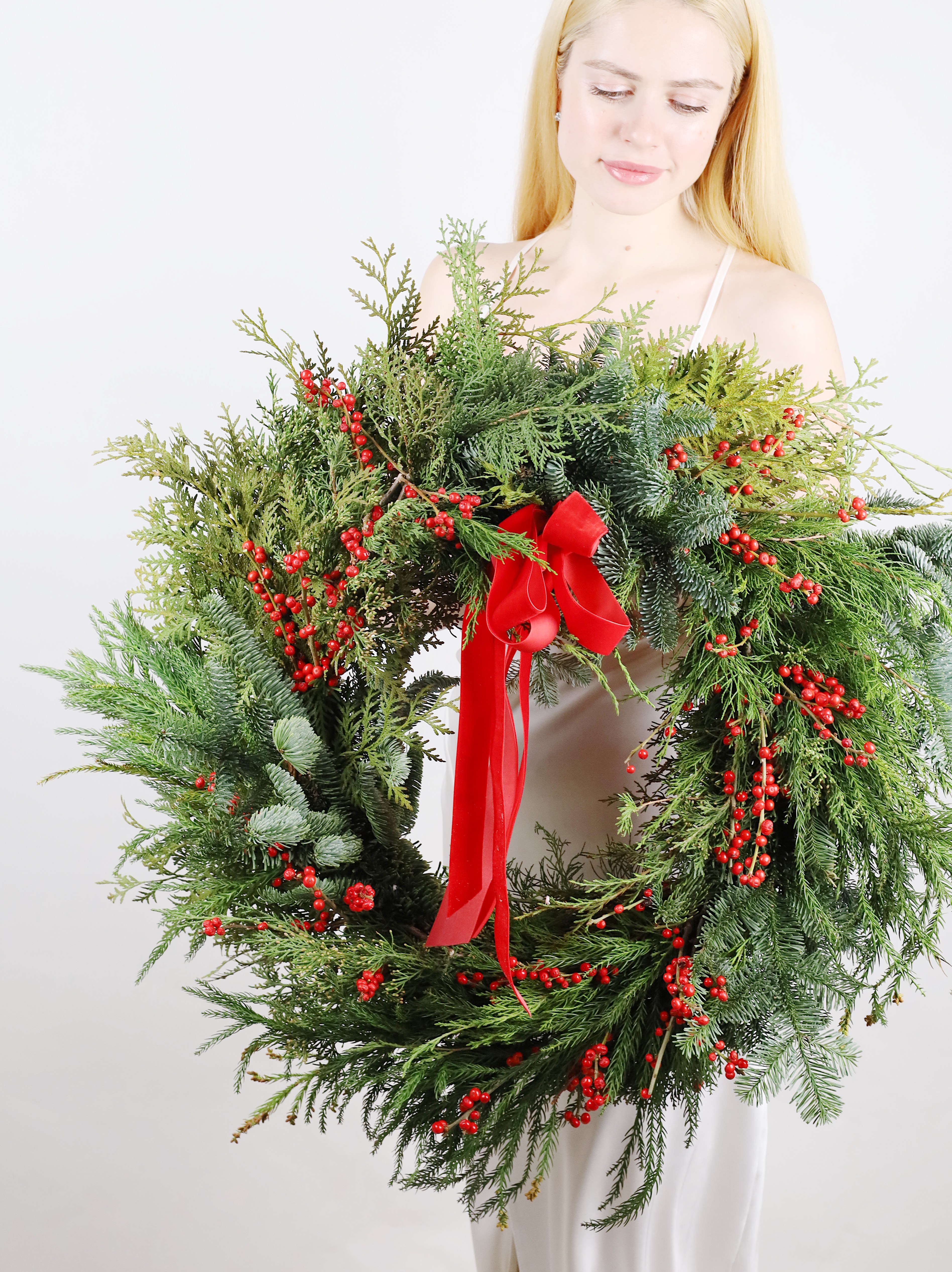 БОЛЬШОЙ ВЕНОК ИЗ МИКСА ХВОИ С ИЛЕКСОМ И БАРХАТНЫМ БАНТОМ