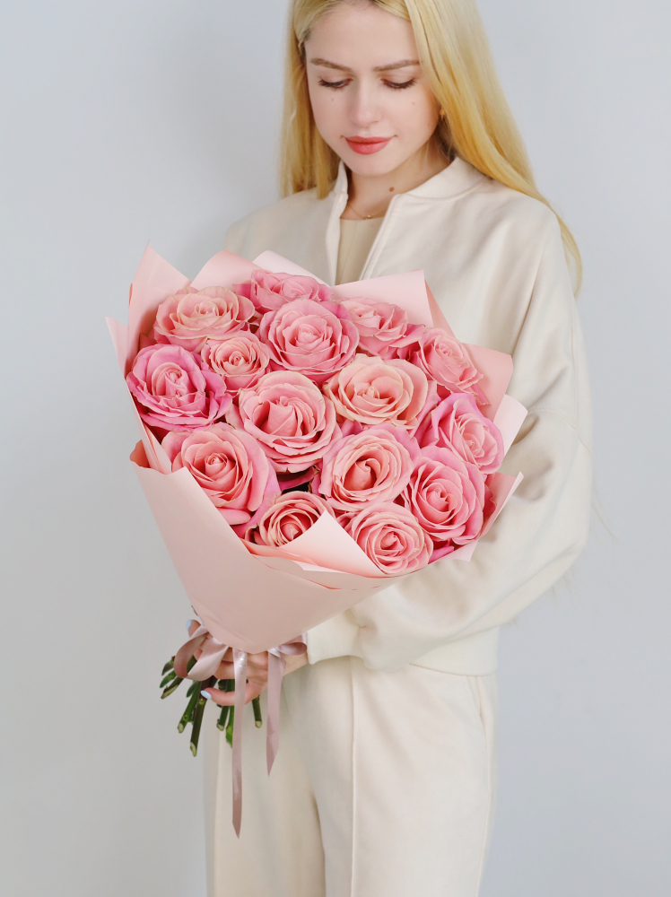 —БУКЕТ 15 РОЗОВЫХ РОЗ
