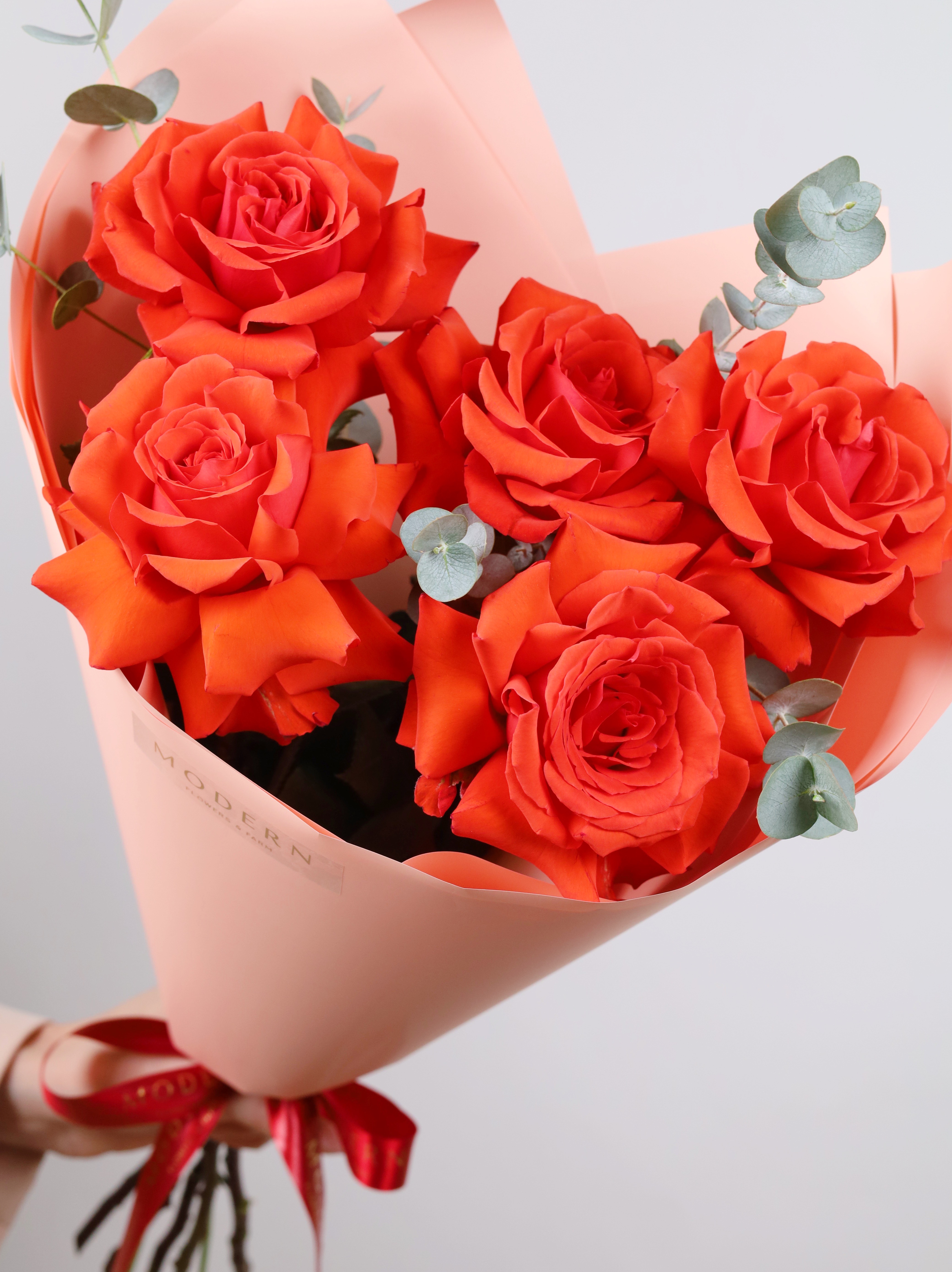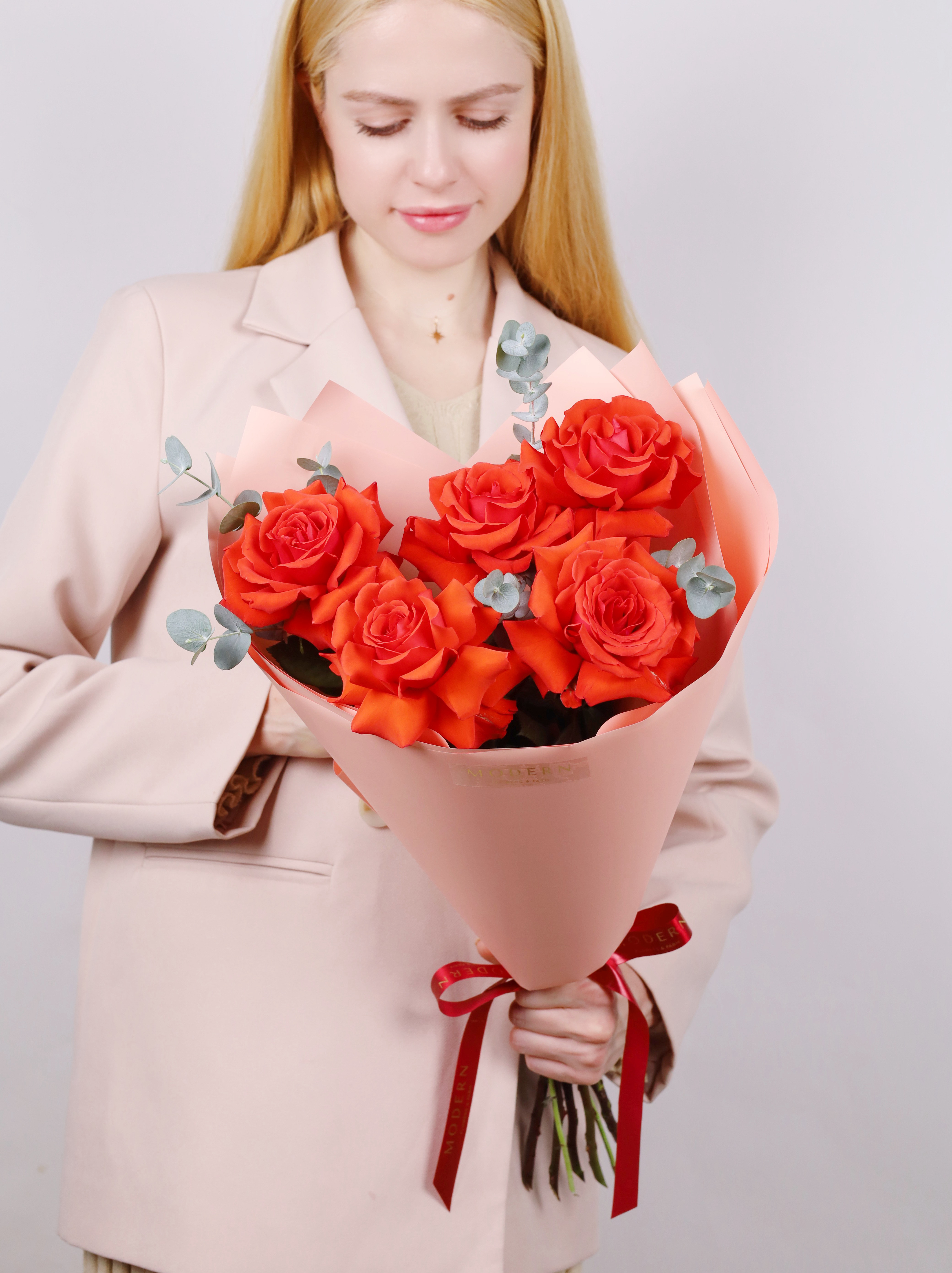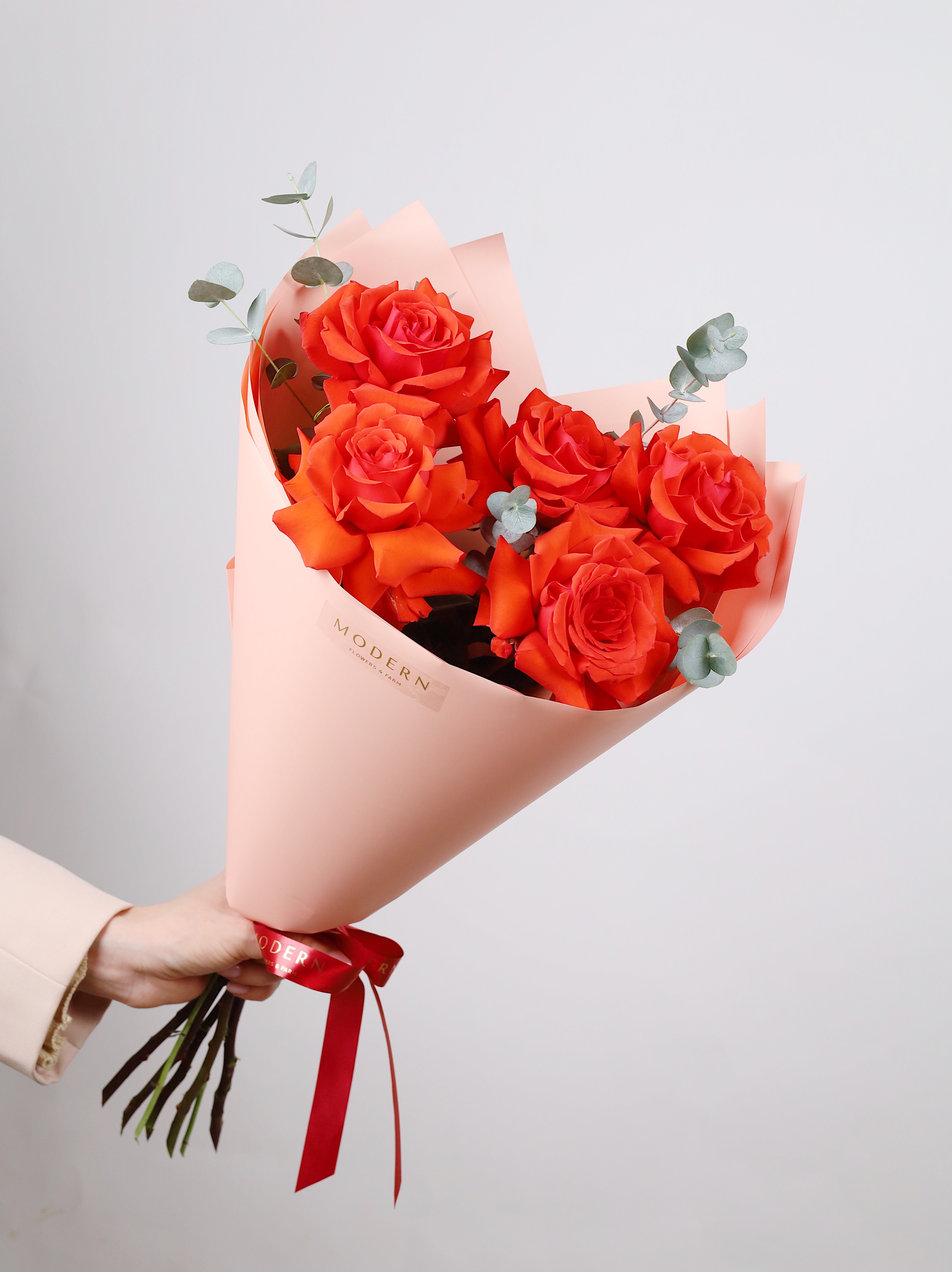 БУКЕТ ИЗ СТОЙКОЙ АЛОЙ ФРАНЦУЗСКОЙ РОЗЫ И ЭВКАЛИПТА