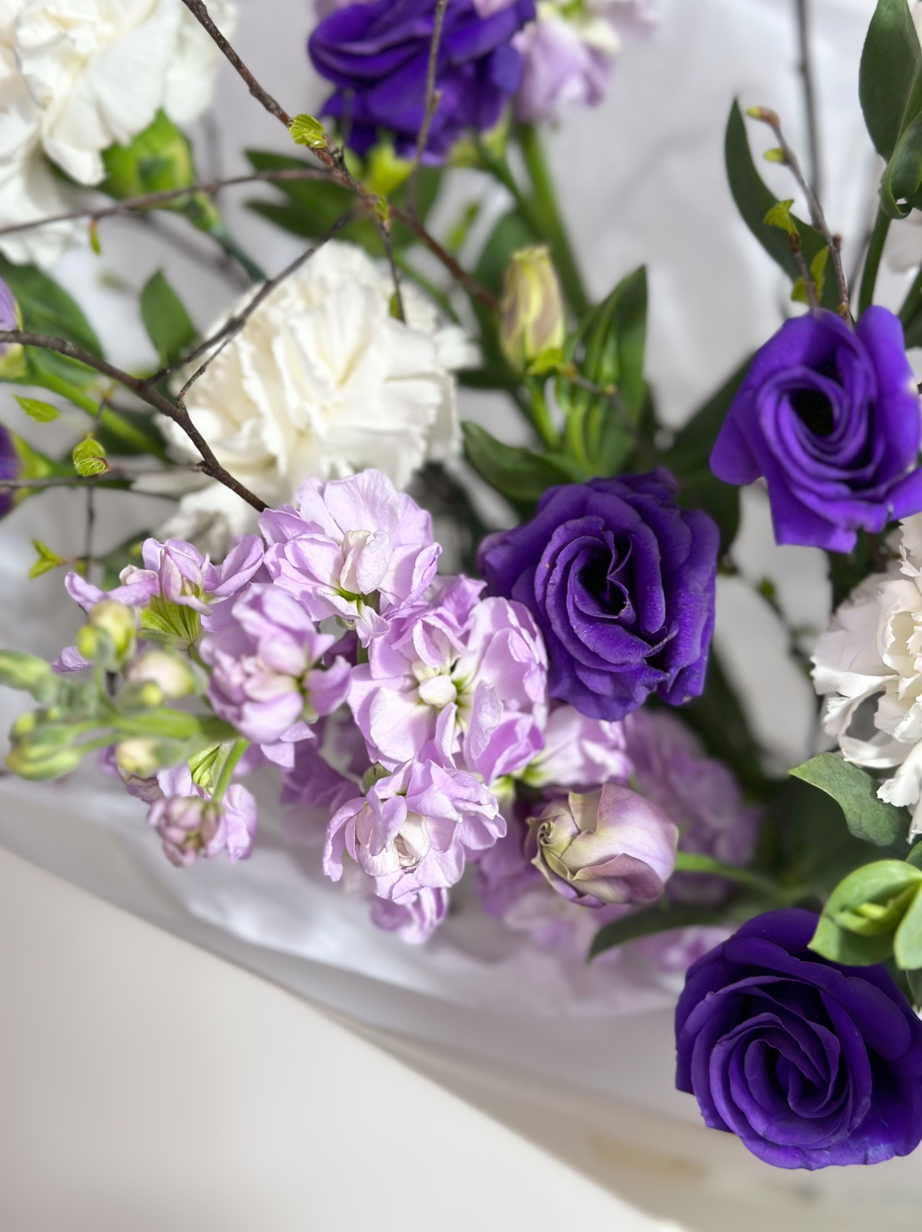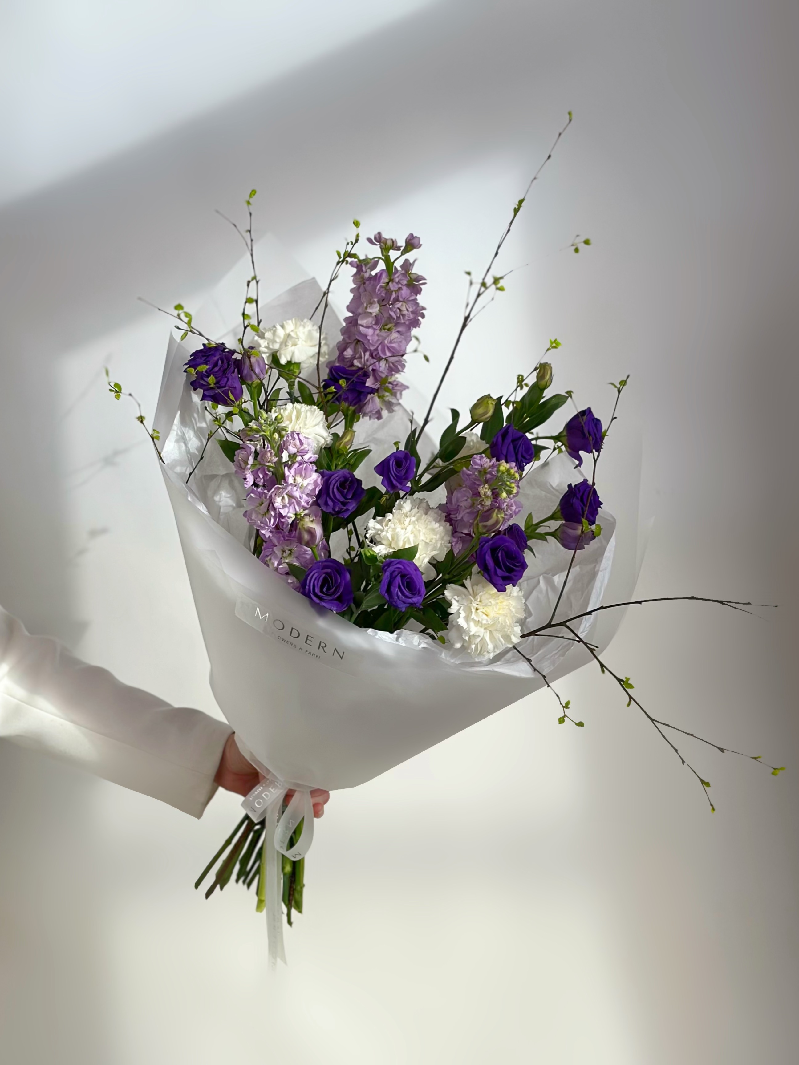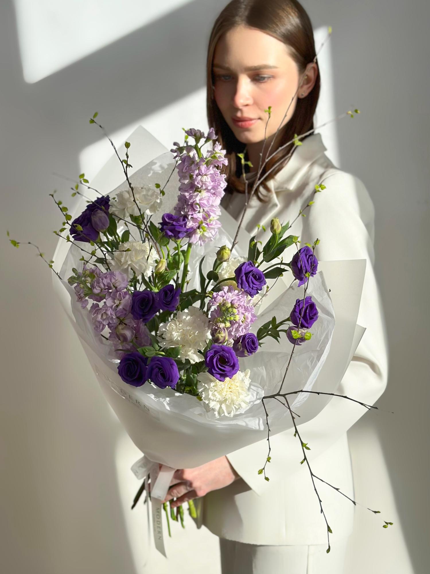 —БУКЕТ С АРОМАТНОЙ МАТТИОЛОЙ, ЭУСТОМОЙ И ВЕСЕННИМИ ВЕТОЧКАМИ