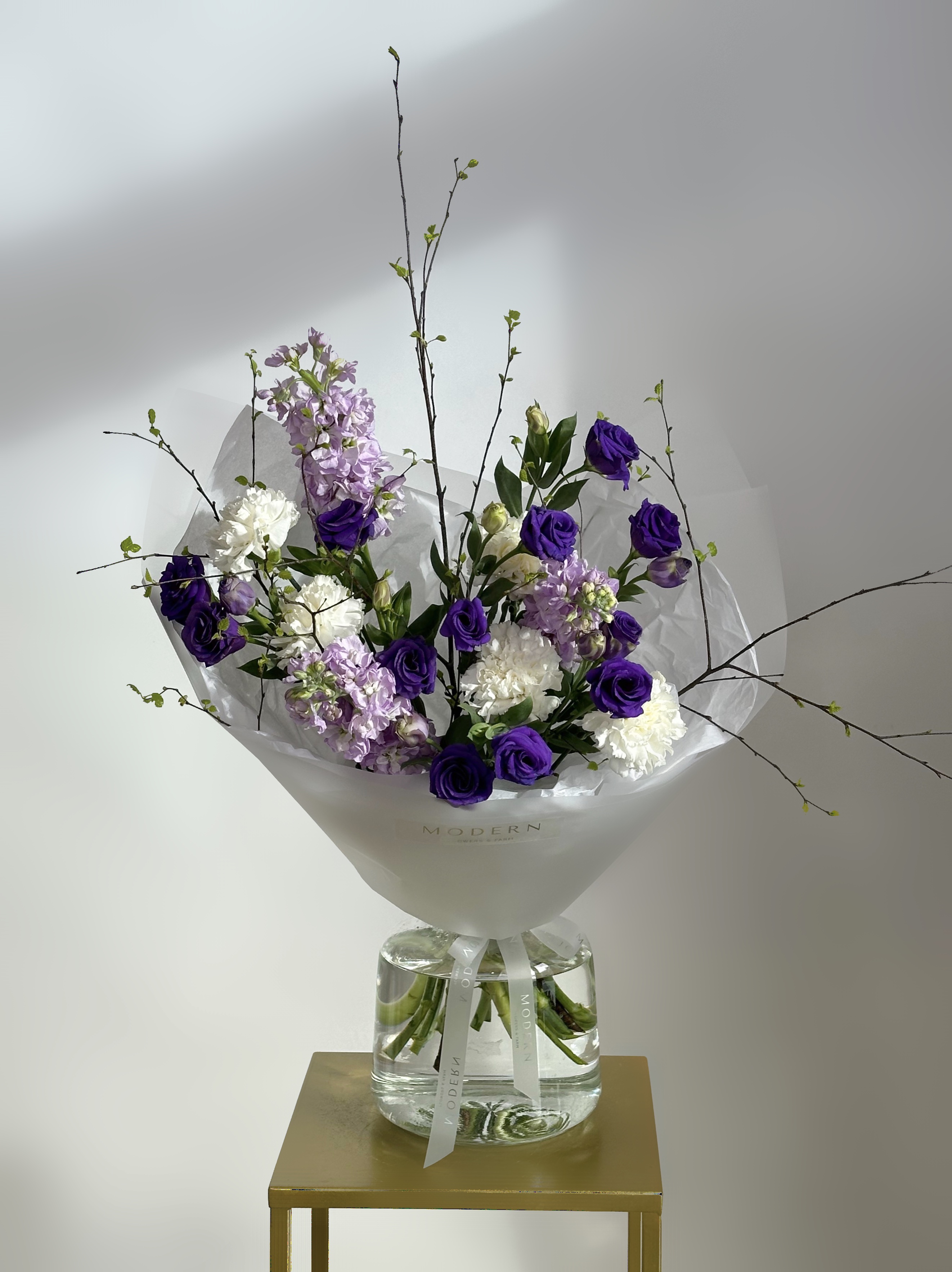 БУКЕТ С АРОМАТНОЙ МАТТИОЛОЙ, ЭУСТОМОЙ И ВЕСЕННИМИ ВЕТОЧКАМИ
