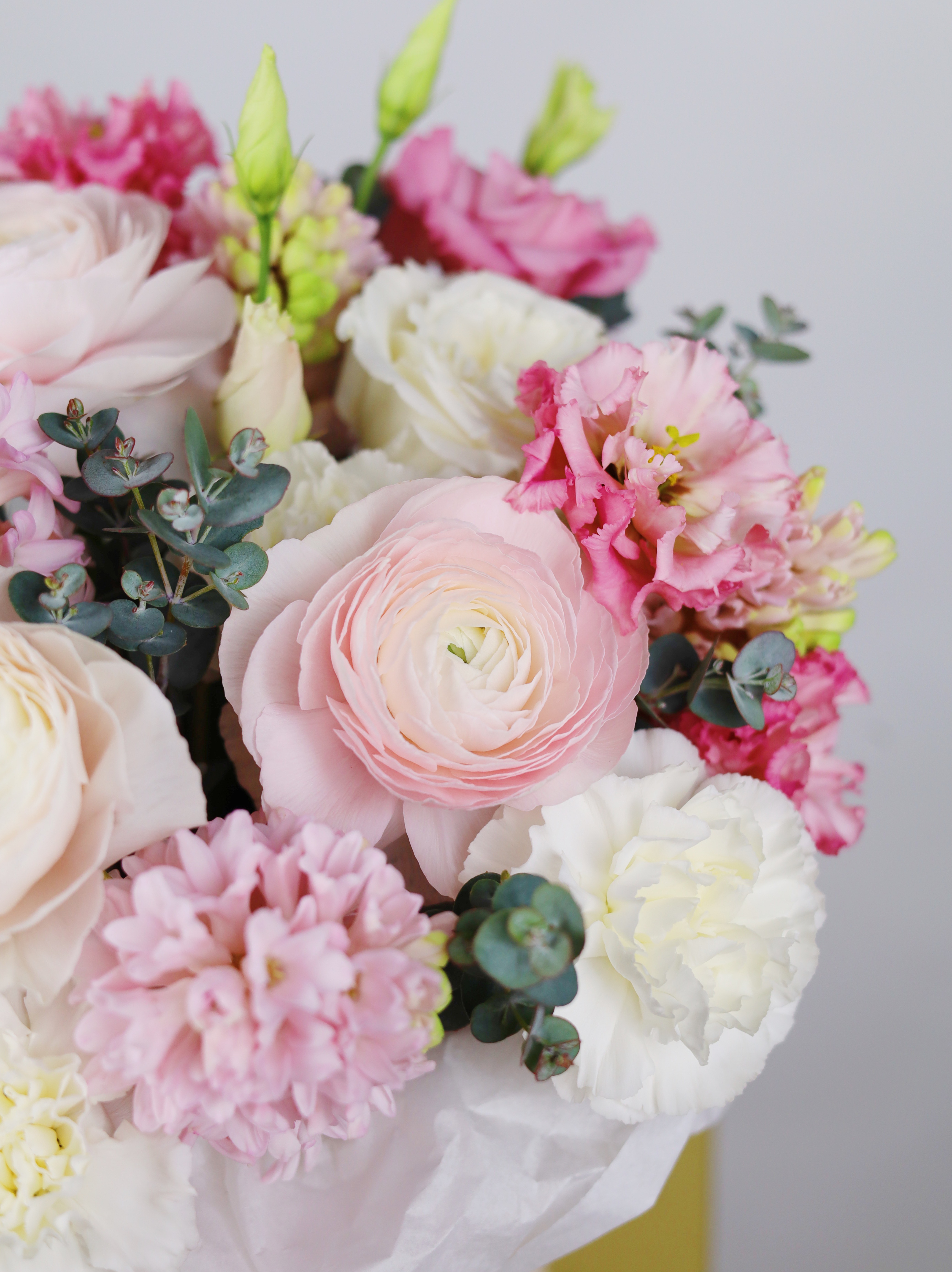 —БУКЕТ С РАНУНКУЛЮСАМИ, ГИАЦИНТОМ И ЛИЗИАНТУСОМ В БАРХАТНОЙ КОРОБКЕ