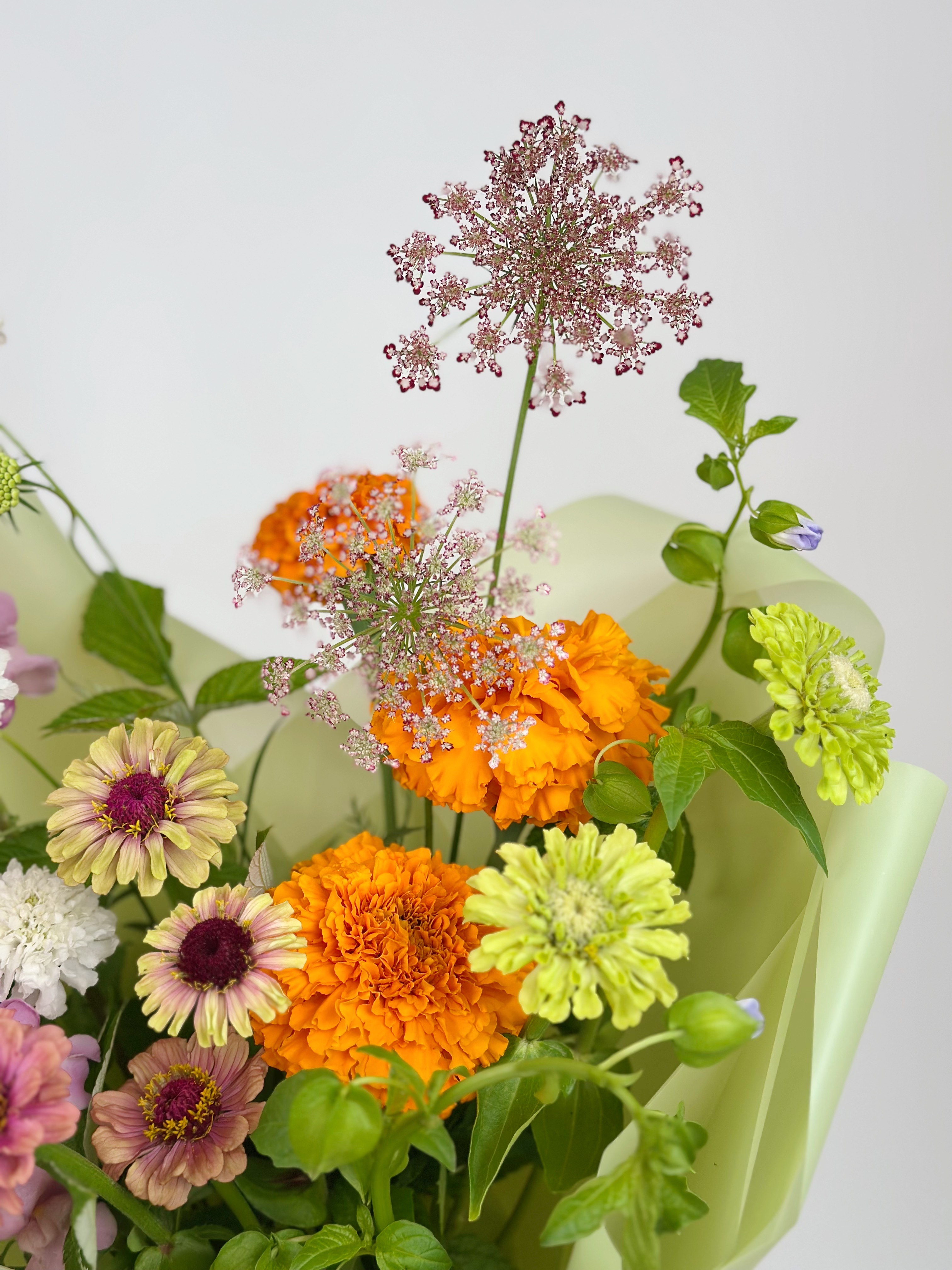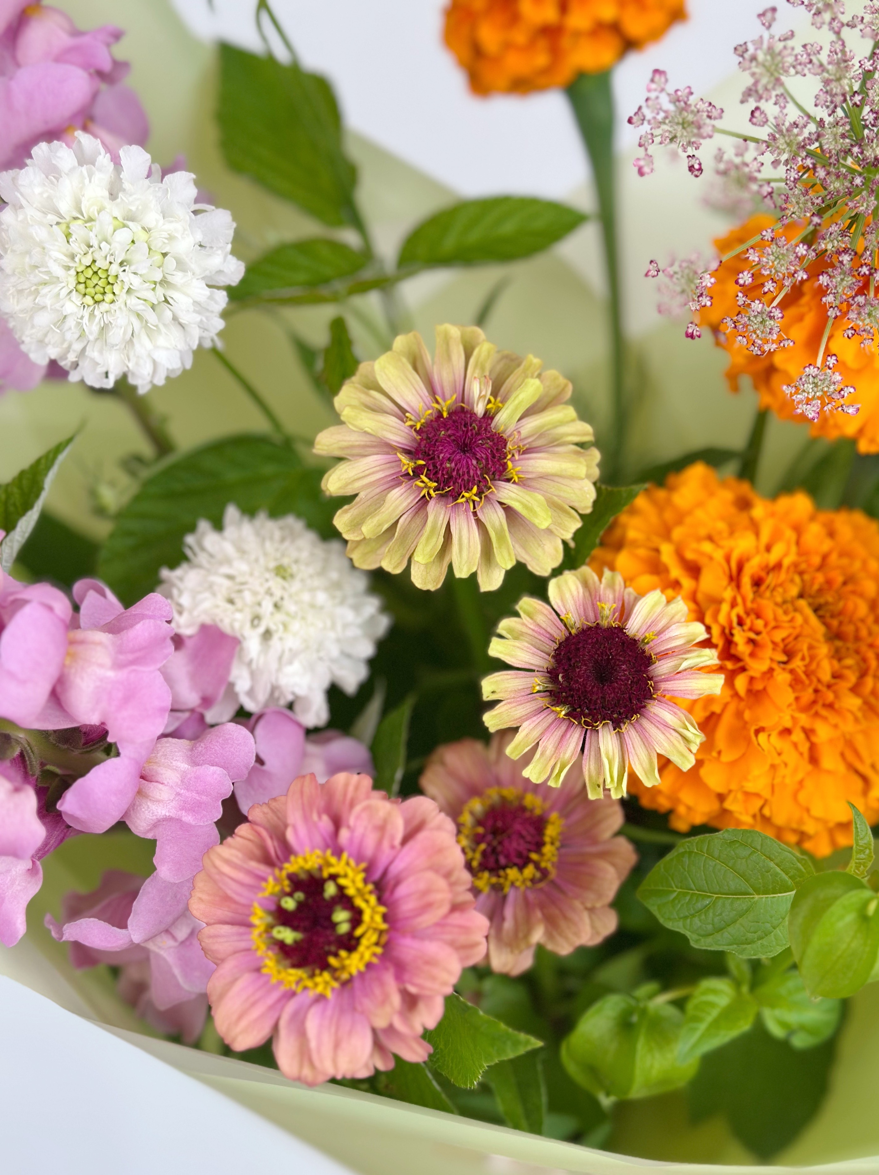 БУКЕТ С ЦИННИЕЙ И ДРУГИМИ ФЕРМЕРСКИМИ ЦВЕТАМИ