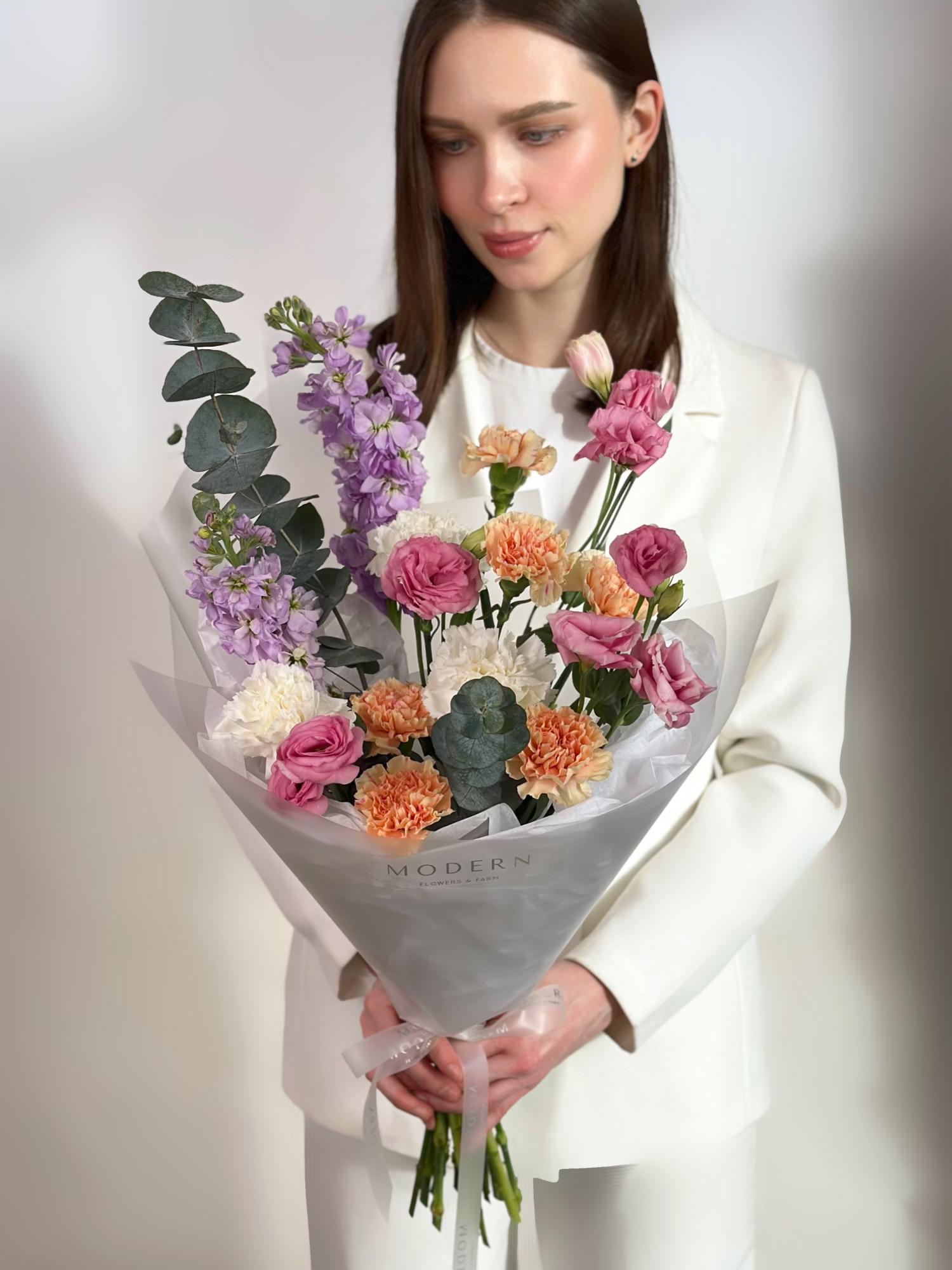 БУКЕТ В ПАСТЕЛЬНЫХ ОТТЕНКАХ С МАТТИОЛОЙ, ЭУСТОМОЙ И ГВОЗДИКОЙ