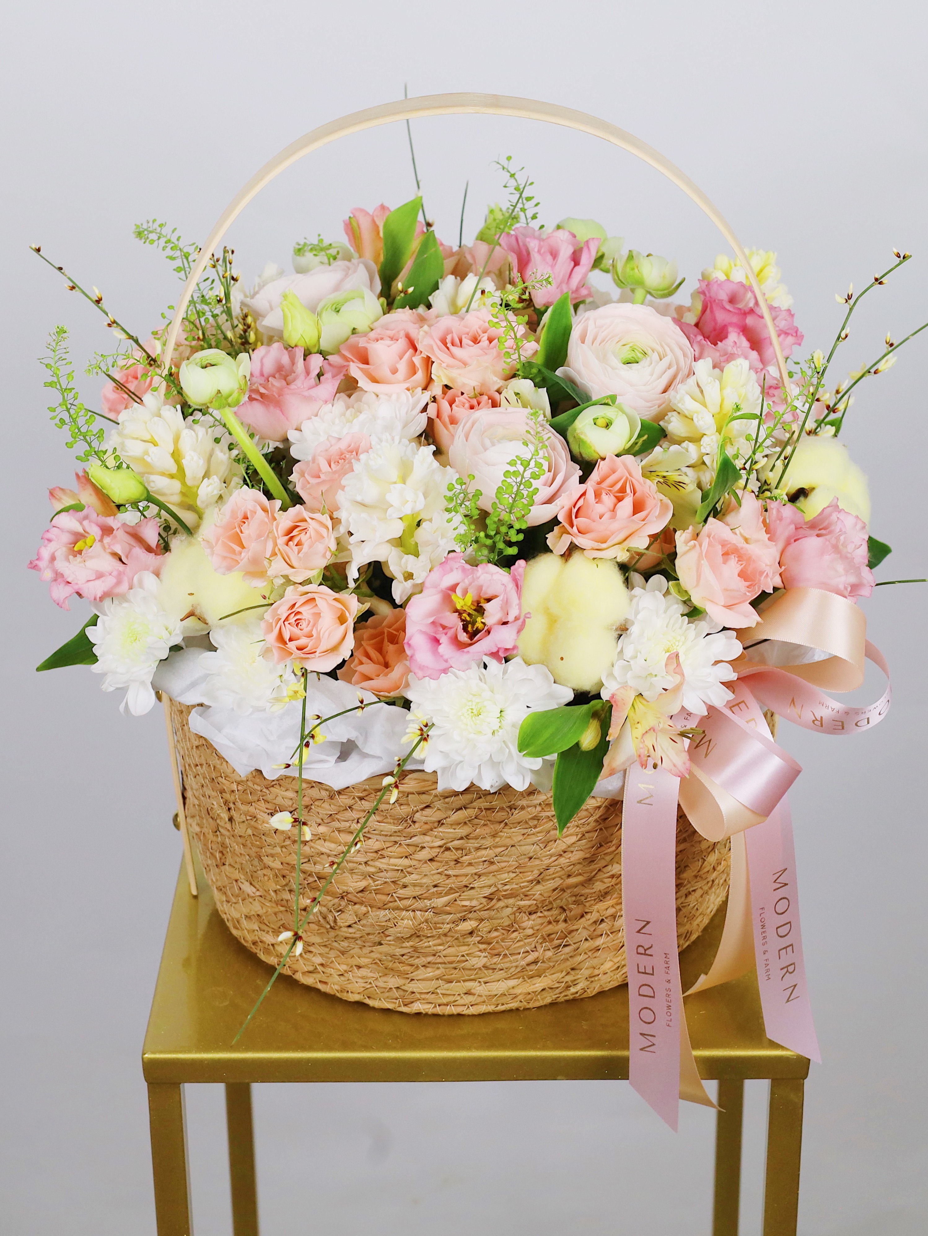 —НЕЖНАЯ КОРЗИНА С РАНУНКУЛЮСАМИ, РОЗОЙ И ХЛОПКОМ