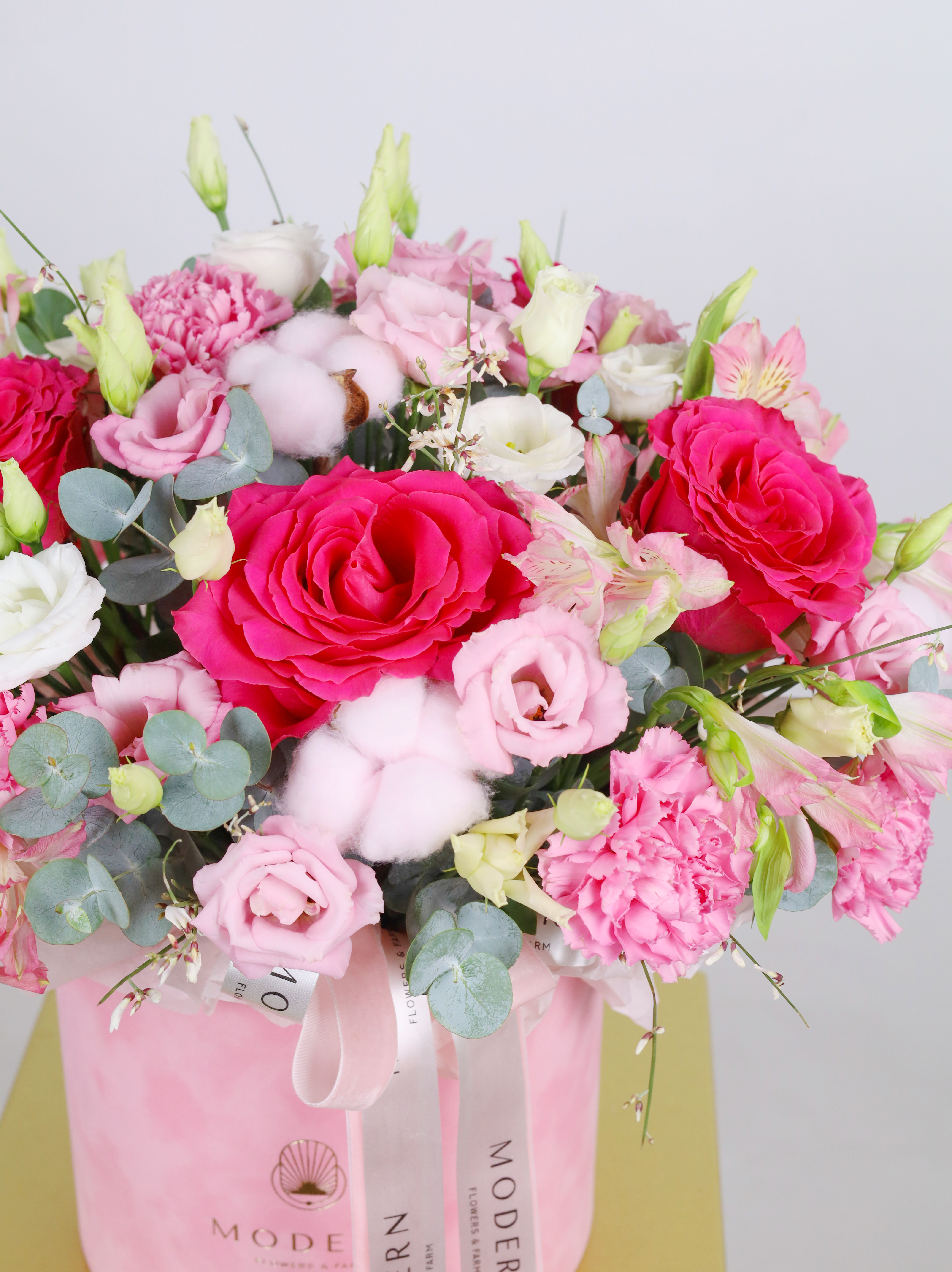 ПИОНОВИДНАЯ РОЗА, ЭУСТОМА, АЛЬСТРОМЕРИЯ В БАРХАТНОЙ ШЛЯПНОЙ КОРОБКЕ