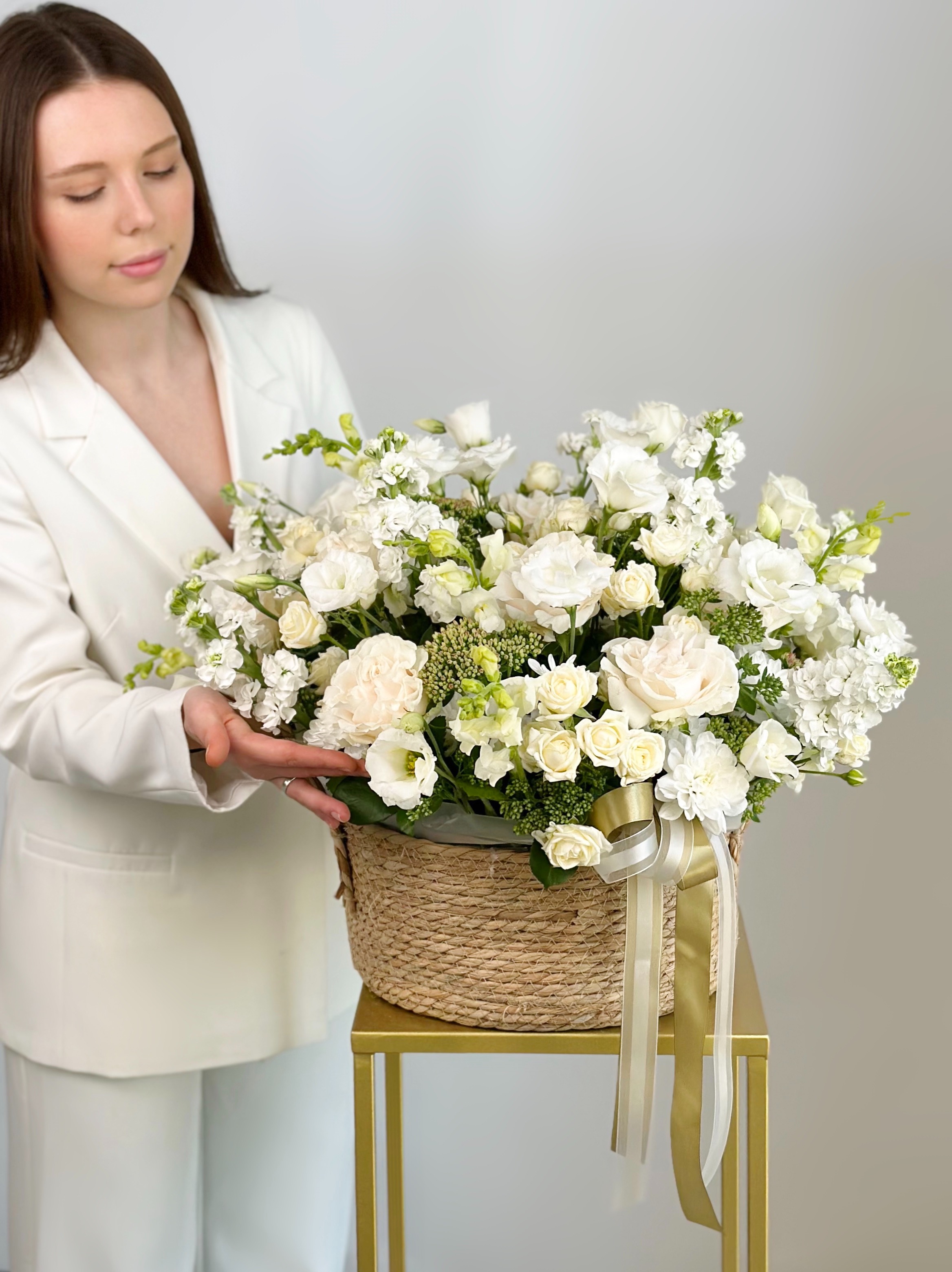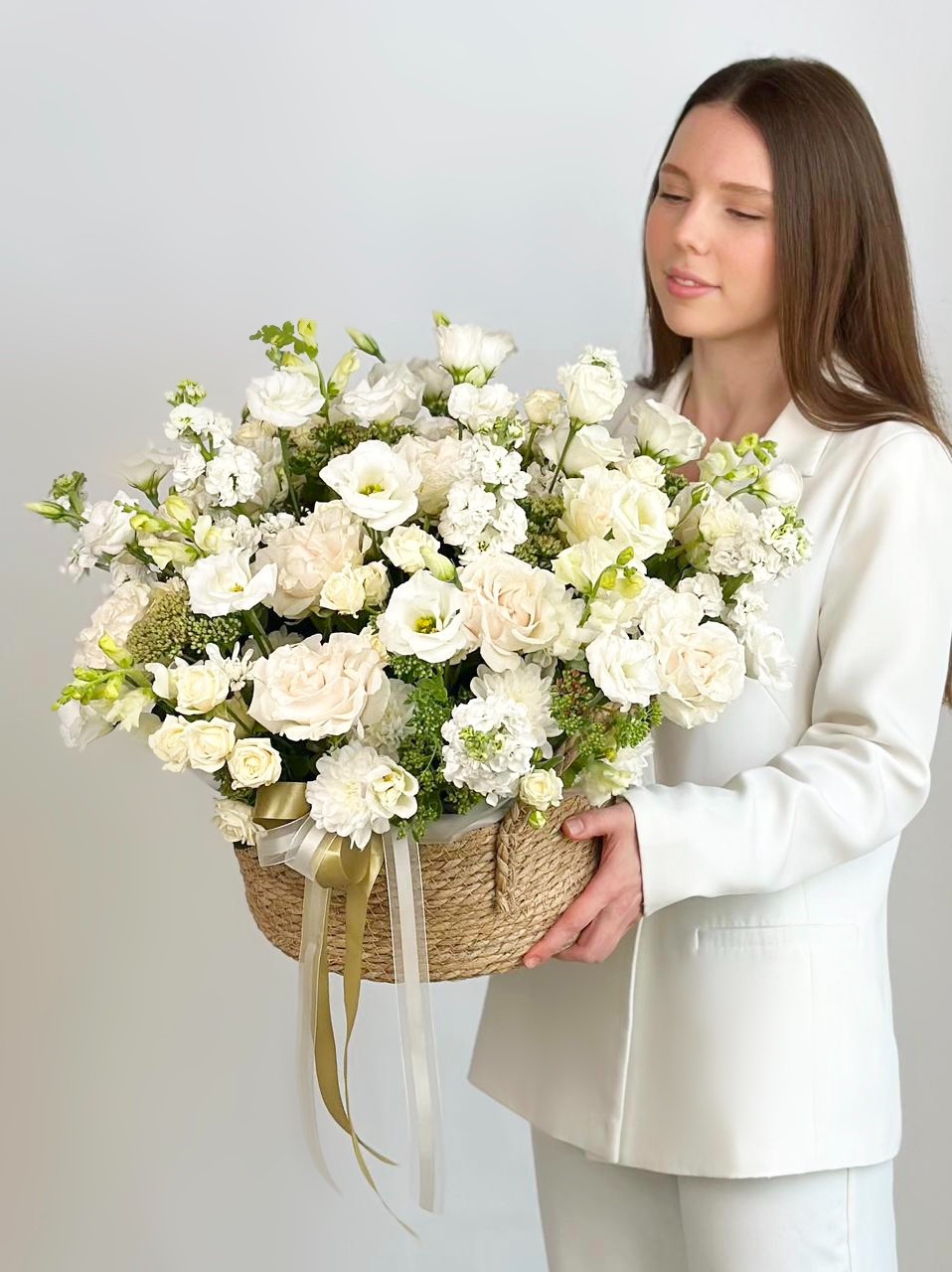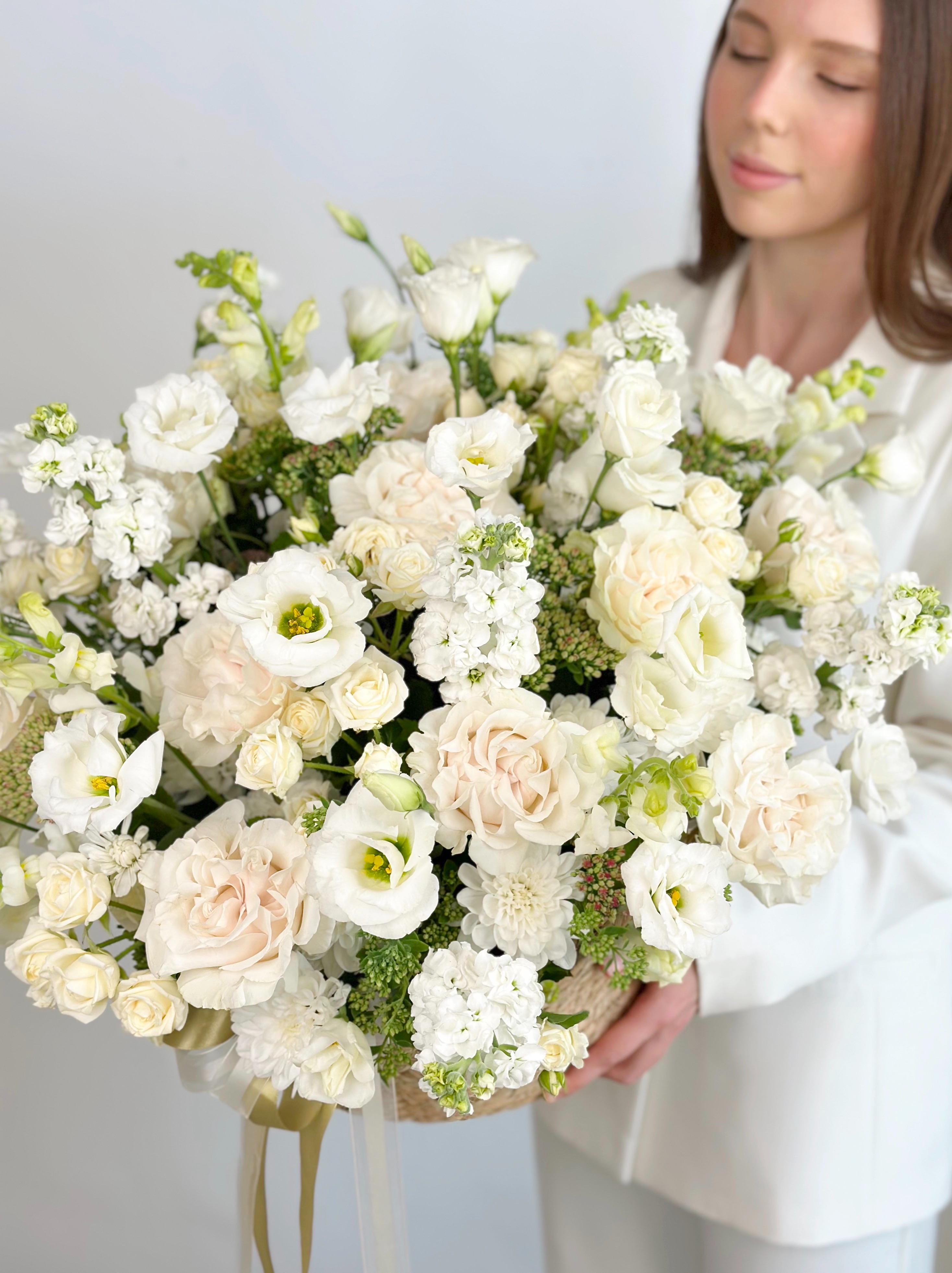 —ПИОНОВИДНАЯ РОЗА, ЭУСТОМА, МАТТИОЛА В БОЛЬШОЙ ПЛЕТЕНОЙ КОРЗИНЕ